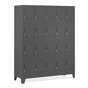 20 Fächer mit Zylinderschloss und jeweils zwei Schlüsseln. Abmessungen 172 cm x 136 cm x 45 cm.