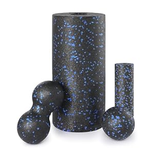 A: Enthalten sind eine große Rolle (15×30 cm), ein kleiner Zylinder (5,3×15 cm), ein Erdnussball (8 cm) und ein Einzelball plus Aufbewahrungstasche; Herstellerangaben nennen Einsatzbereiche wie Rücken, Beine und Nacken.
